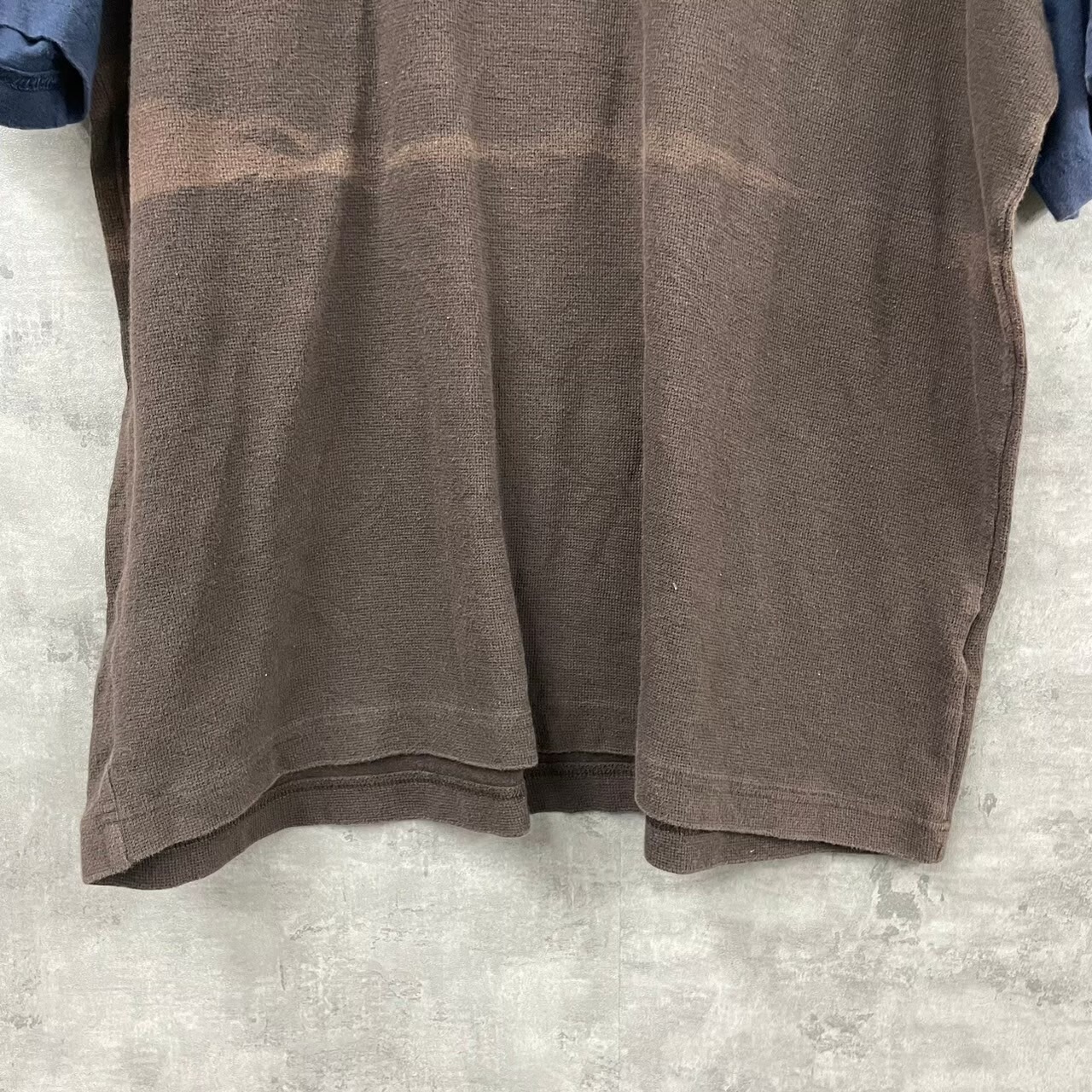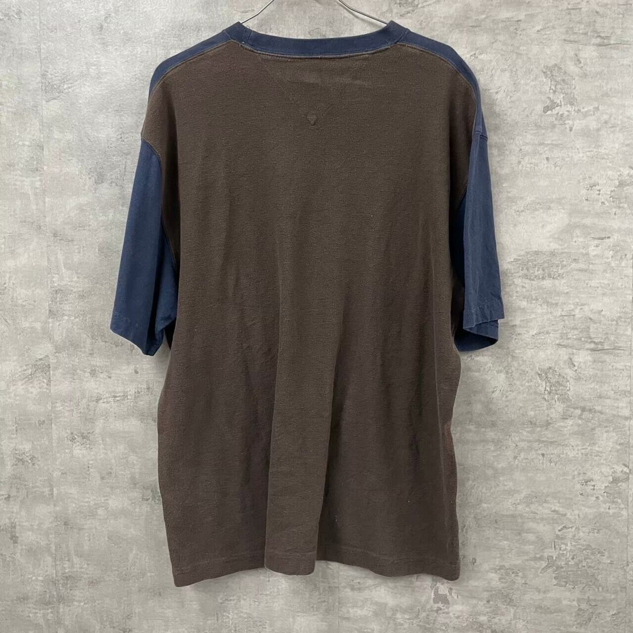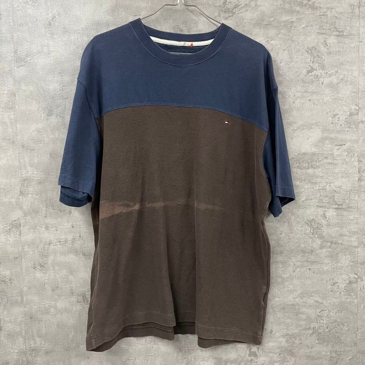 TOMMY HILFIGER トミーヒルフィガー Tシャツ 半袖 ブラウン ネイビー バイカラー L メンズ ワッフル 刺繍ロゴ 古着 TK10108